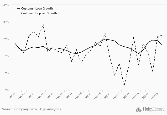 On the other hand, bank's customer deposit growth amounted to 22.1% at the end of 2019-06-30, up from 17.1% when compared to the previous year. Historically, the bank’s deposit growth reached an all time high of 28.5% in 2013-03-31 and an all time low of -7.75% in 2017-06-30. In the last decade, the average annual loan growth amounted to 0%.