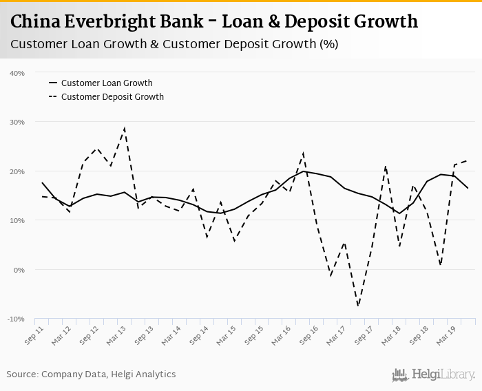 China Everbright Bank's customer loan growth reached 16.4% in 2019-06-30, up from 13.4% compared to the previous year. Historically, the bank’s loans growth reached an all time high of 19.8% in 2016-06-30 and an all time low of 11.3% in 2018-03-31. In the last decade, the average annual loan growth amounted to 0%.