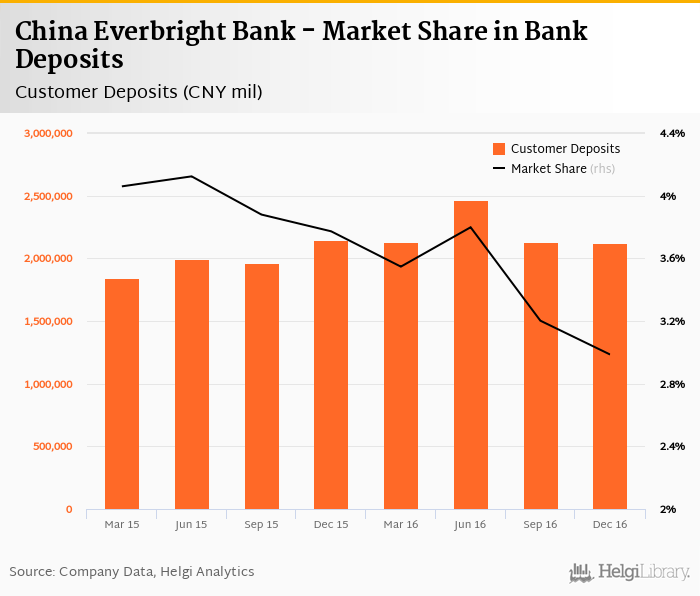 China Everbright Bank accounted for 2.99% of all customer deposits taken by banks in China at the end of 2016-12-31. Historically, the bank’s market share in customer deposits reached an all time high of 4.12% in 2015-06-30 and an all time low of 2.99% in 2016-12-31.