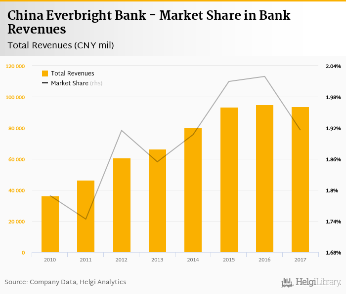 As a result, China Everbright Bank accounted for 1.92% of all bank revenues generated by banks in China in 2017. Historically, the bank’s market share in total revenues reached an all time high of 2.02% in 2016 and an all time low of 1.74% in 2011.