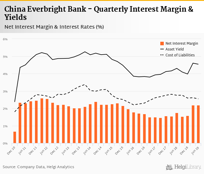 China Everbright Bank's net interest margin amounted to 2.18% in the second quarter of 2019, down from 2.18% when compared to the previous quarter.