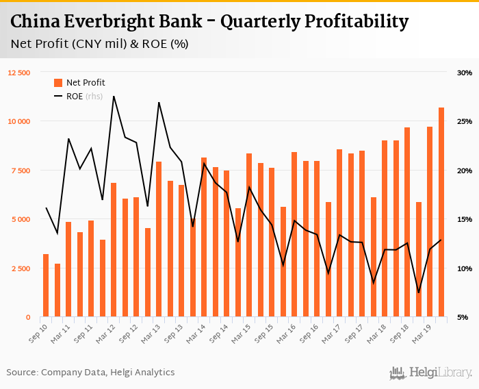 China Everbright Bank made a net profit of CNY 10,711 mil in the second quarter of 2019, up 18.7% when compared to the same period of last year. This implies a return on equity of 12.8%.