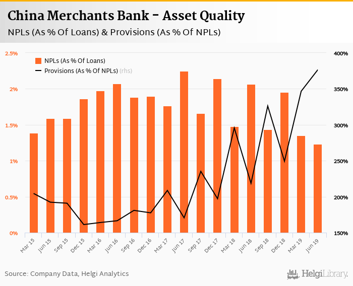Comparing China Merchants Bank with its closest peers, Industrial & Commercial Bank of China operated at the end of 2019-06-30 with NPL ratio of 1.59% and provision coverage of 161%, China Construction Bank with 1.44% and 216% respectively and China CITIC Bank had 2.33% of bad loans covered with 122% by provisions at the end of 2019-06-30.