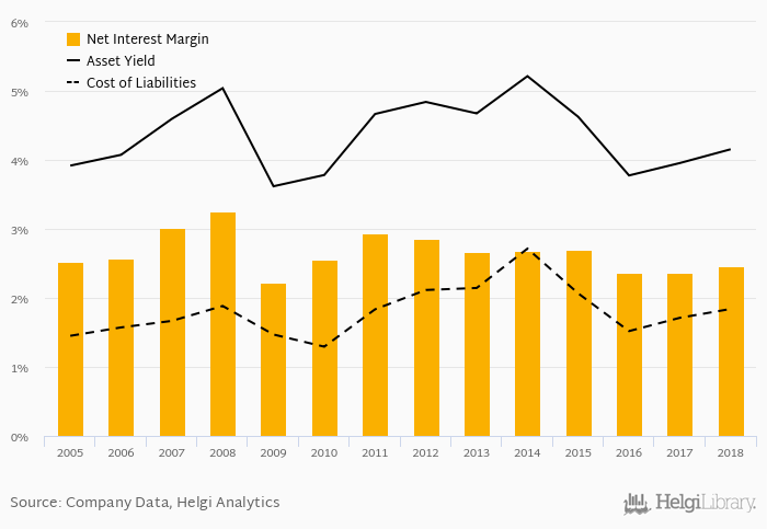 Historically, the bank’s net interest margin reached an all time high of 3.25% in 2008 and an all time low of 2.22% in 2009. The average margin in the last five years amounted to 2.51%.