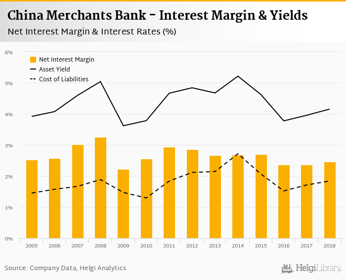 Comparing China Merchants Bank with its closest peers, Industrial & Commercial Bank of China operated in 2018 with a net interest margin of 2.13% in 2018, China Construction Bank reached 2.15% and China CITIC Bank some 1.78%.