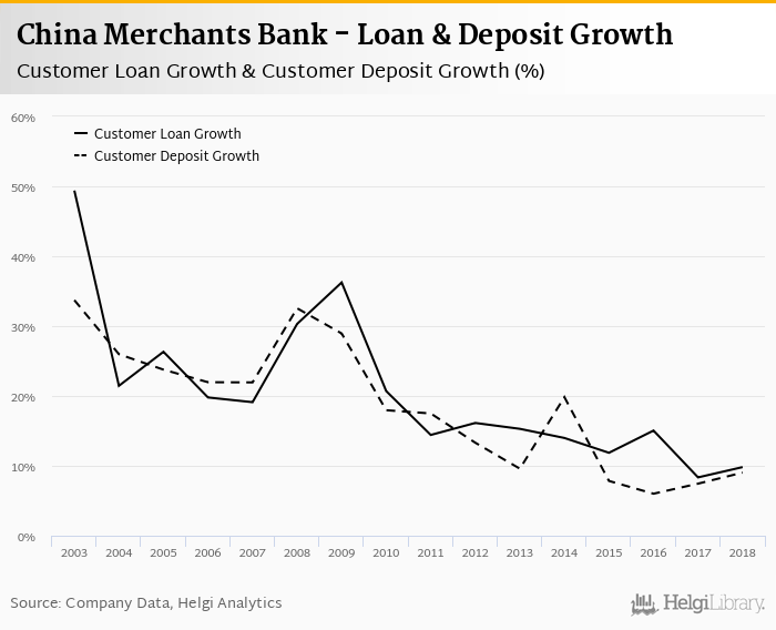 China Merchants Bank's customer loan growth reached 9.82% in 2018, up from 8.34% compared to the previous year. Historically, the bank’s loans growth reached an all time high of 49.4% in 2003 and an all time low of 8.34% in 2017. In the last decade, the average annual loan growth amounted to 16.0%.