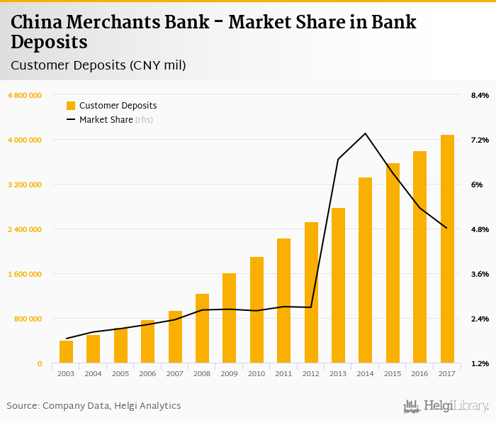 China Merchants Bank accounted for 4.81% of all customer deposits taken by banks in China at the end of 2017. Historically, the bank’s market share in customer deposits reached an all time high of 7.35% in 2014 and an all time low of 1.85% in 2003.