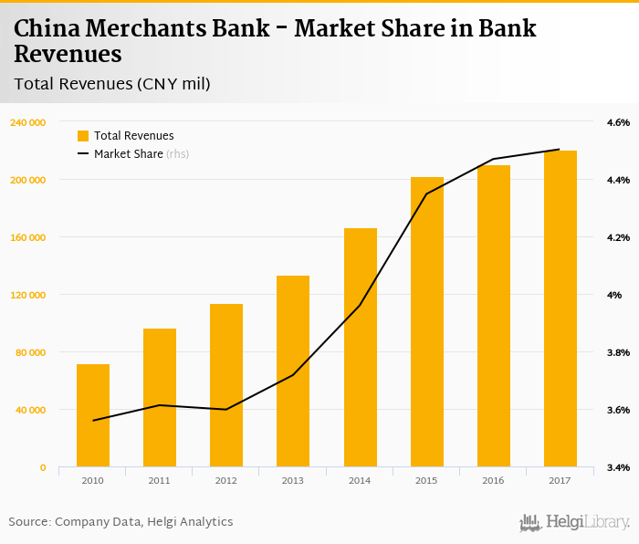 As a result, China Merchants Bank accounted for 4.50% of all bank revenues generated by banks in China in 2017. Historically, the bank’s market share in total revenues reached an all time high of 4.50% in 2017 and an all time low of 3.56% in 2010.