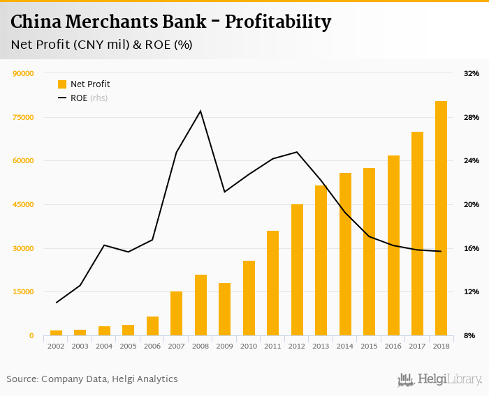 Comparing China Merchants Bank with its closest peers, Industrial & Commercial Bank of China generated a net profit of CNY 293,170 mil with ROE of 13.2% in 2018, China Construction Bank netted CNY 254,655 mil (ROE of 13.6%) and China CITIC Bank announced a net profit of CNY 44,513 mil implying ROE of 10.3%.