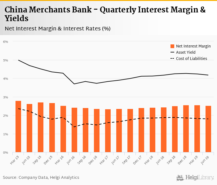 China Merchants Bank's net interest margin amounted to 2.52% in the second quarter of 2019, down from 2.56% when compared to the previous quarter.