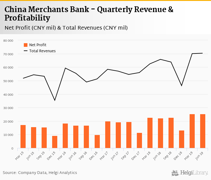 China Merchants Bank made a net profit of CNY 25,372 mil under revenues of CNY 70,329 mil in the second quarter of 2019, up 14.9% and 6.94% respectively when compared to the same period last year.