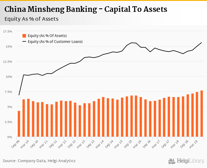 China Minsheng Banking's Equity reached 8.57% of total assets in the 2Q2019, up from 7.94% for the previous year. As a share of net customer loans, the ratio amounted to 15.6% at the end of the second quarter of 2019.