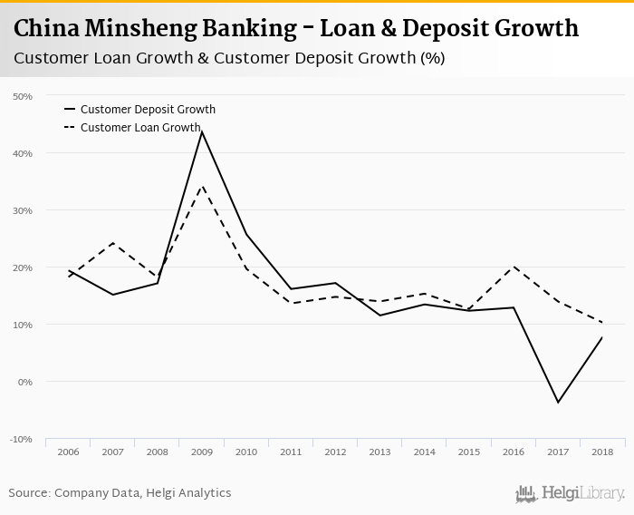 China Minsheng Banking's customer loan growth reached 10.2% in 2018, down from 13.9% compared to the previous year. Historically, the bank’s loans growth reached an all time high of 34.2% in 2009 and an all time low of 10.2% in 2018. In the last decade, the average annual loan growth amounted to 16.6%.