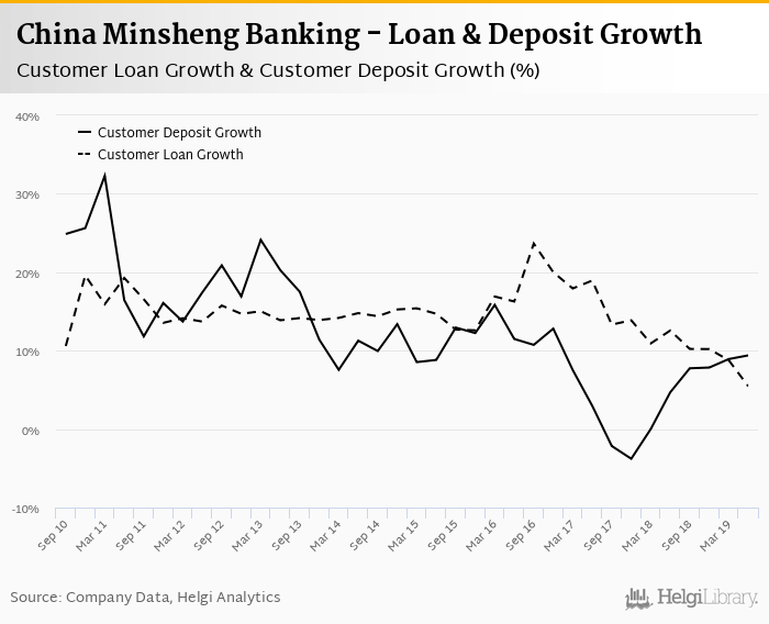 China Minsheng Banking's customer loan growth reached 5.47% in 2019-06-30, down from 12.6% compared to the previous year. Historically, the bank’s loans growth reached an all time high of 23.7% in 2016-09-30 and an all time low of 5.47% in 2019-06-30. In the last decade, the average annual loan growth amounted to 0%.