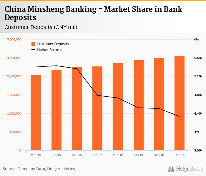 China Minsheng Banking accounted for 4.33% of all customer deposits taken by banks in China at the end of 2016-12-31. Historically, the bank’s market share in customer deposits reached an all time high of 5.43% in 2015-06-30 and an all time low of 4.33% in 2016-12-31.