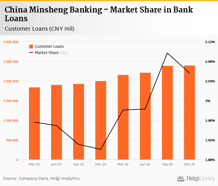 China Minsheng Banking accounted for 2.06% of all customer loans issued in China at the end of 2016-12-31. Historically, the bank’s market share in customer loans reached an all time high of 2.10% in 2016-09-30 and an all time low of 1.90% in 2015-12-31.