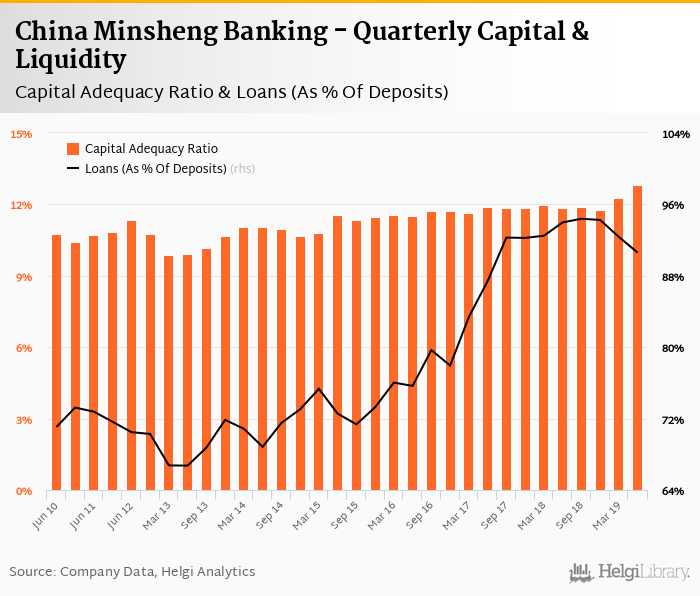 China Minsheng Banking's capital adequacy ratio reached 12.8% at the end of second quarter of 2019, up from 12.3% when compared to the previous quarter. Historically, the bank’s capital ratio hit an all time high of 12.8% in 2Q2019 and an all time low of 9.87% in 1Q2013.