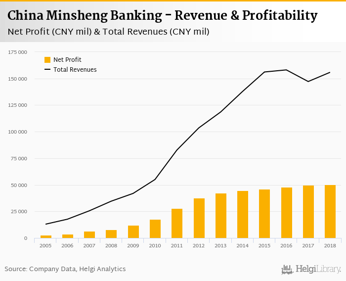 China Minsheng Banking made a net profit of CNY 50,327 mil under revenues of CNY 155,861 mil in 2018, up 1.03% and 5.90% respectively compared to the previous year.