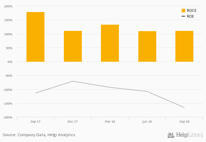 The result implies a return on equity of -166% and a return on invested capital of 112% in 3Q2018. That is compared to an average of -101% and 129% over the last five years.