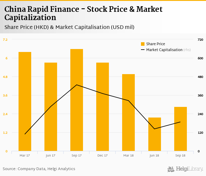 China Rapid Finance stock traded at HKD 2.86 per share at the end 3Q2018 implying a market capitalization of USD 187 mil.