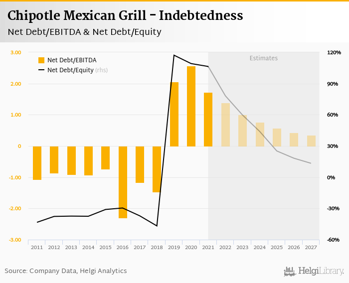 Chipotle Mexican Grill's net debt stood at USD 2,444 mil and accounted for 106% of equity at the end of 2021. The ratio is down 2.79 pp compared to the previous year.