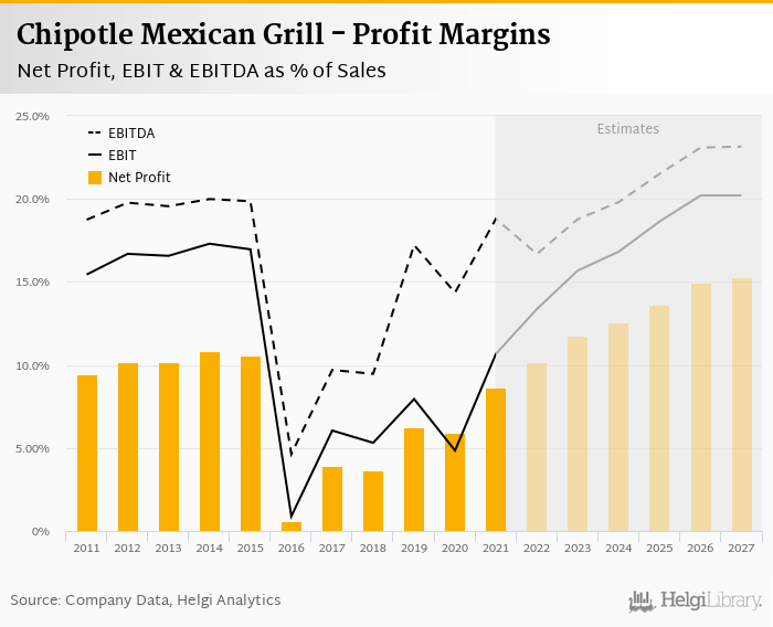 Chipotle Mexican Grill made a net profit of USD 653 mil with revenues of USD 7,547 mil in 2021, up by 83.5% and up by 26.1%, respectively, compared to the previous year.