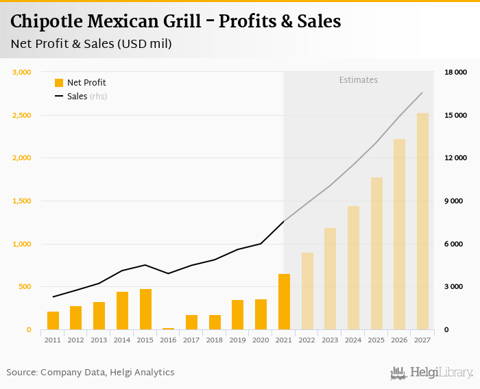 Chipotle Mexican Grill made a net profit of USD 653 mil in 2021, up 83.5% compared to the previous year. Total sales reached USD 7,547 mil, which is up 26.1% when compared to the previous year.