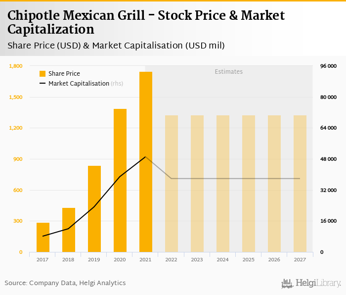 Chipotle Mexican Grill stock traded at USD 1,748 per share at the end 2021 implying a market capitalization of USD 49,091 mil.