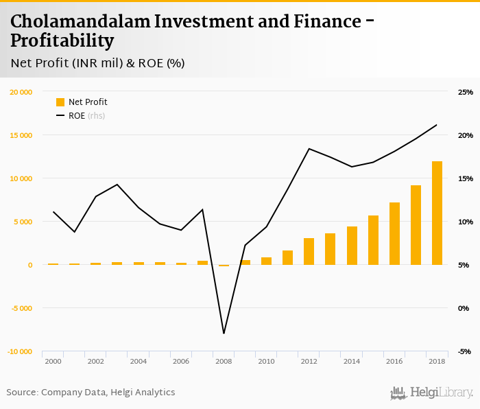 Cholamandalam Investment and Finance made a net profit of INR 11,981 mil in 2018, up 30.3% compared to the previous year. This implies a return on equity of 21.1%.