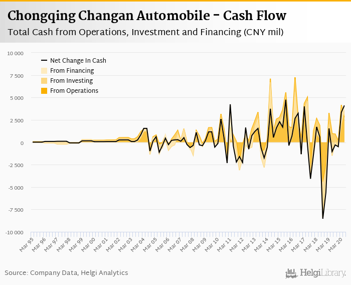 At the end of 2Q2020, the company had a net debt of CNY -2,052 mil, or -0.364x of EBITDA and -4.41% of equity. Net working capital amounted to CNY 9,763 mil, or 46.0% of sales. Cash conversion cycle is negative and reached 36.2 days days in 2Q2020. This means Chongqing Changan Automobile generates revenue from customers before it has to pay its suppliers for inventory, among other things.