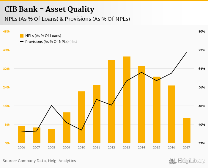 CIB Bank's non-performing loans reached 10.8% of total loans at the end of 2017, down from 24.7% compared to the previous year. Historically, the NPL ratio hit an all time high of 37.3% in 2013 and an all time low of 6.07% in 2008.