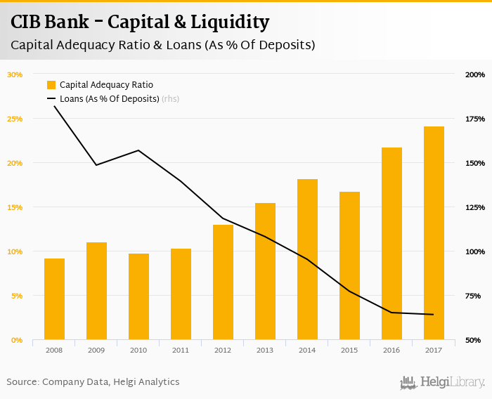CIB Bank's capital adequacy ratio reached 24.1% at the end of 2017, up from 21.8% compared to the previous year. Historically, the bank’s capital ratio hit an all time high of 24.1% in 2017 and an all time low of 9.20% in 2008.