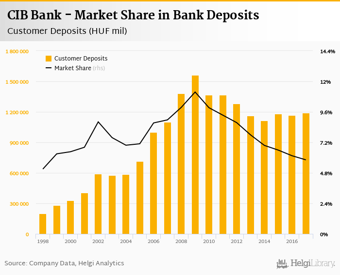 CIB Bank accounted for 5.82% of all customer deposits taken by banks in Hungary at the end of 2017. Historically, the bank’s market share in customer deposits reached an all time high of 11.2% in 2009 and an all time low of 5.10% in 1998.