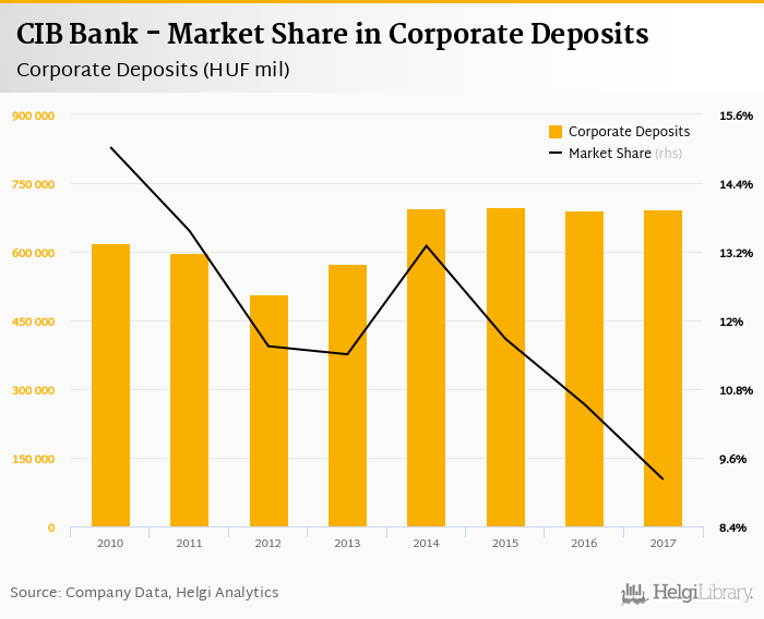 CIB Bank accounted for 9.22% of all corporate deposits taken by banks in Hungary at the end of 2017. Historically, the bank’s market share in corporate deposits reached an all time high of 15.0% in 2010 and an all time low of 9.22% in 2017.