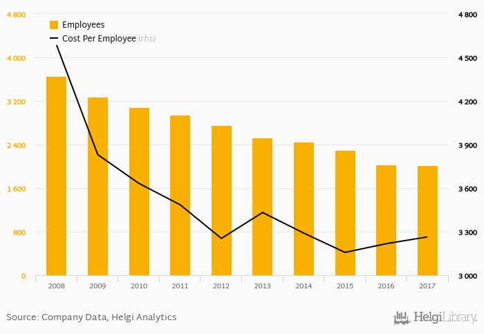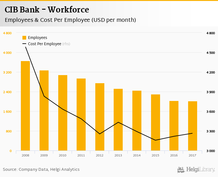CIB Bank employed 2,014 persons in 2017, down 1.08% when compared to the previous year. Historically, the bank's workforce hit an all time high of 3,657 persons in 2008 and an all time low of 2,014 in 2017.