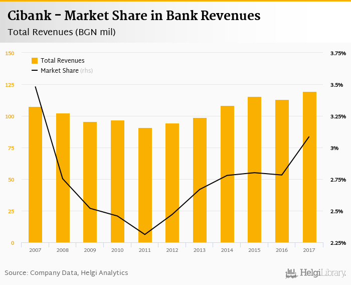 As a result, Cibank accounted for 3.09% of all bank revenues generated by banks in Bulgaria in 2017. Historically, the bank’s market share in total revenues reached an all time high of 3.48% in 2007 and an all time low of 2.31% in 2011.
