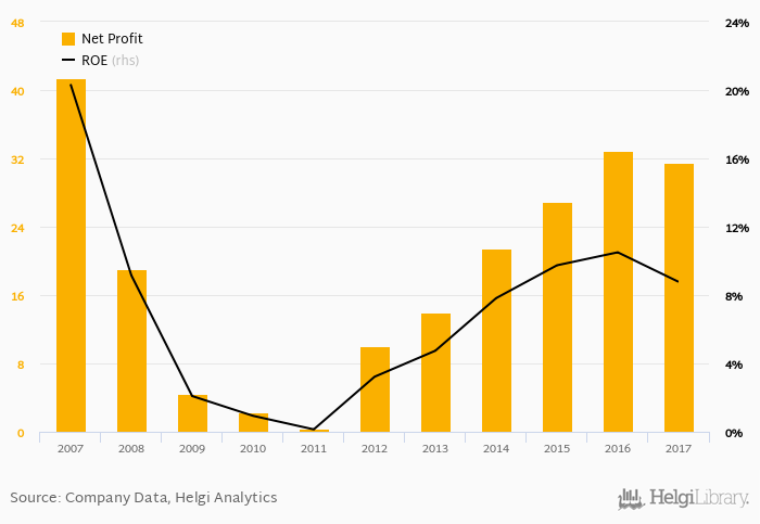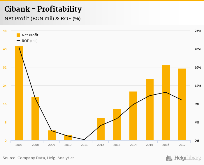Cibank made a net profit of BGN 31.5 mil in 2017, down 4.30% compared to the previous year. This implies a return on equity of 8.78%.