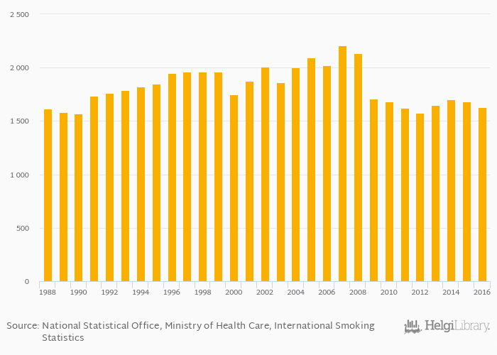 Historically, cigarette consumption per capita of 15+ years old in Estonia reached an all time high of 2,205 per year in 2007 and an all time low of 1,570 per year in 1990.