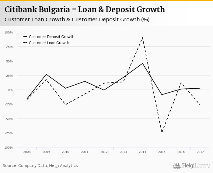 At the end of 2017, Citibank Bulgaria's loans accounted for 15.5% of total deposits and 15.3% of total assets.