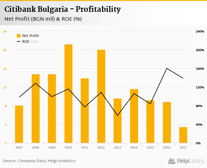 Citibank Bulgaria made a net profit of BGN 3.40 mil in 2017, down 61.3% compared to the previous year. This implies a return on equity of 139%.
