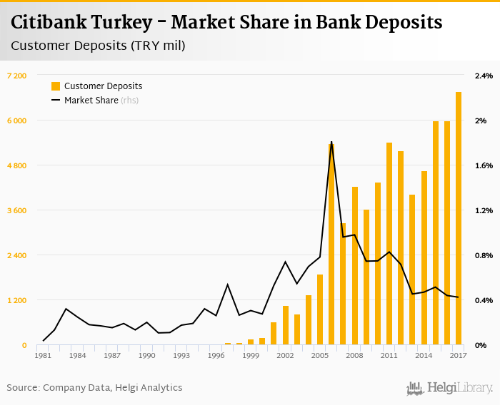 Citibank Turkey accounted for 0.420% of all customer deposits taken by banks in Turkey at the end of 2017. Historically, the bank’s market share in customer deposits reached an all time high of 1.81% in 2006 and an all time low of 0.030% in 1981.
