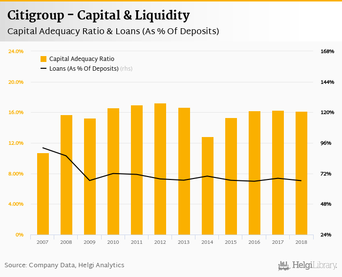 Citigroup's capital adequacy ratio reached 16.2% at the end of 2018, down from 16.3% compared to the previous year. Historically, the bank’s capital ratio hit an all time high of 17.3% in 2012 and an all time low of 10.7% in 2007.
