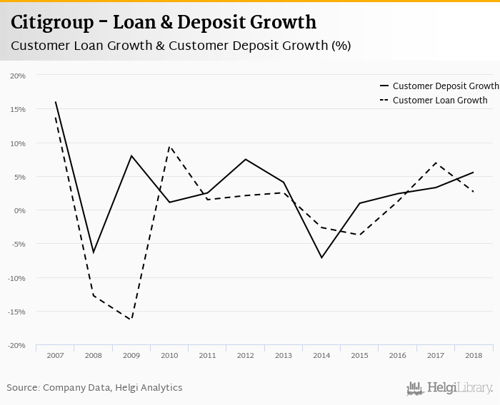 Citigroup's customer loan growth reached 2.63% in 2018, down from 6.92% compared to the previous year. Historically, the bank’s loans growth reached an all time high of 13.7% in 2007 and an all time low of -16.4% in 2009. In the last decade, the average annual loan growth amounted to 0.109%.