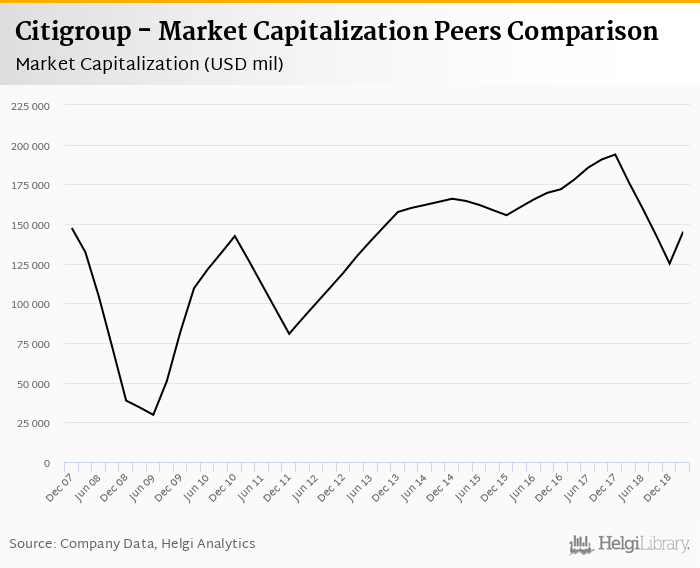 Citigroup stock traded at JPY 2,137 per share at the end of first quarter of 2019 implying a market capitalization of USD 4,383 mil.