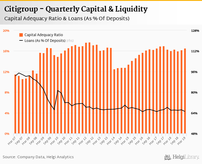 Citigroup's capital adequacy ratio reached 16.5% at the end of first quarter of 2019, up from 16.2% when compared to the previous quarter. Historically, the bank’s capital ratio hit an all time high of 17.7% in 2Q2012 and an all time low of 10.6% in 3Q2007.