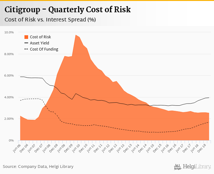 Citigroup's Cost of Risk (loan loss provisions as % of total assets) amounted to 2.52% in the first quarter of 2019, down from 2.57% when compared to the previous quarter.