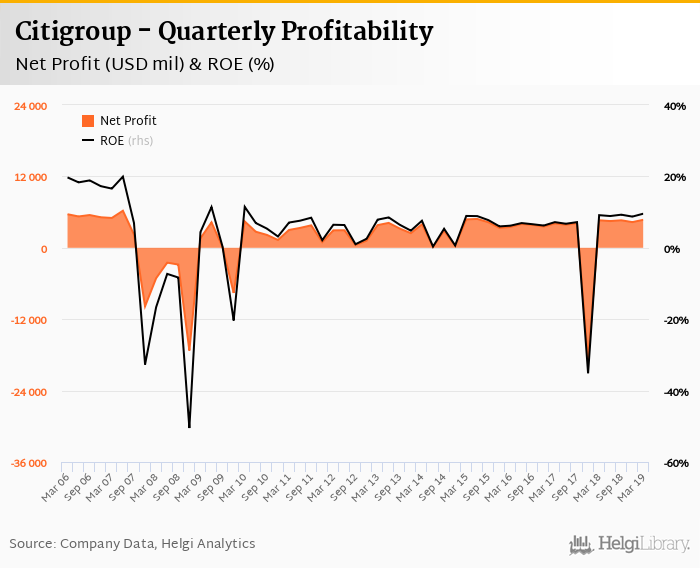 Citigroup made a net profit of USD 4,710 mil in the first quarter of 2019, up 1.95% when compared to the same period of last year. This implies a return on equity of 9.56%.
