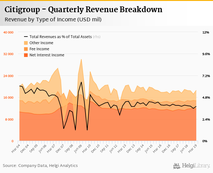 Citigroup generated total banking revenues of USD 18,576 mil in the first quarter of 2019, down 1.57% when compared to the same period of last year and up 8.48% when compared to the previous quarter.