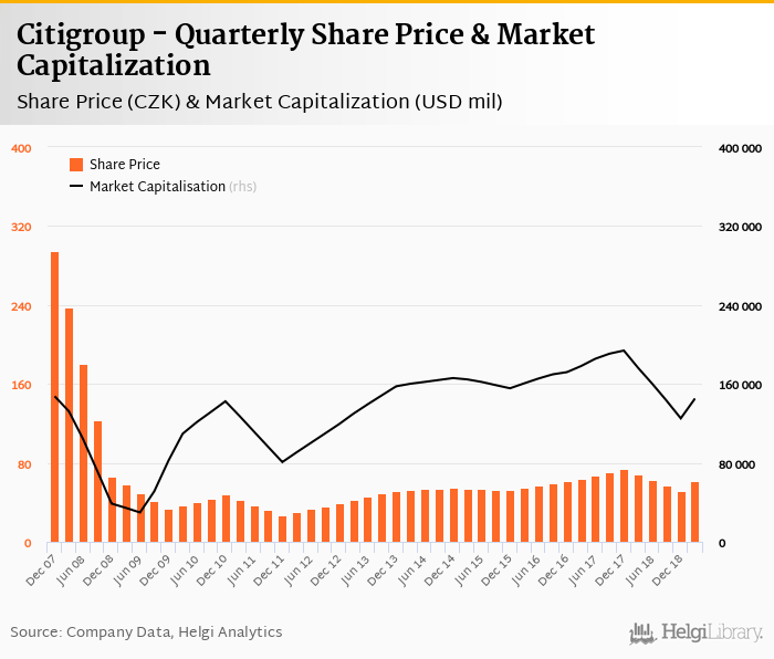 Citigroup stock traded at CZK 62.0 per share at the end of first quarter of 2019 implying a market capitalization of USD 145,182 mil.