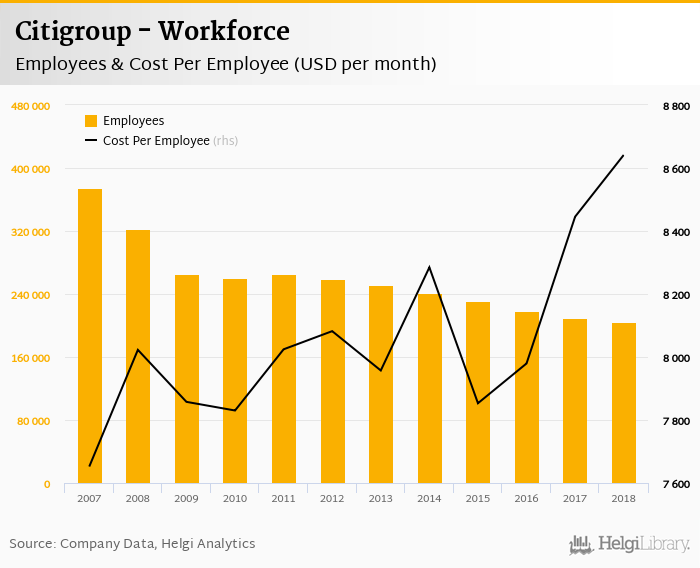 Citigroup employed 204,000 persons in 2018, down 2.39% when compared to the previous year. Historically, the bank's workforce hit an all time high of 375,000 persons in 2007 and an all time low of 204,000 in 2018.